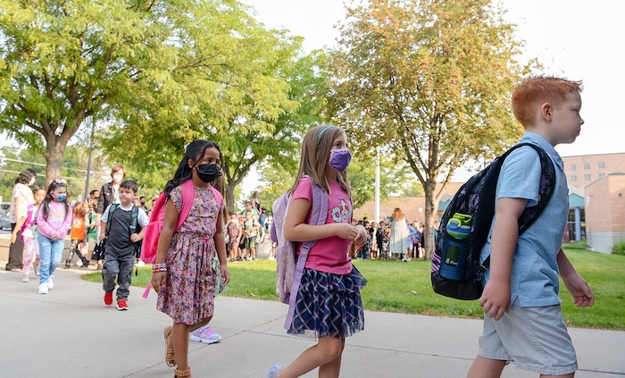 Roughly half of the children outside Whittier Elementary School Monday morning wore cloth masks, as they lined up and found their friends. Oakley Drake, a third grader, wore a pink mask that matched her backpack decorated with puppies and flowered headband.