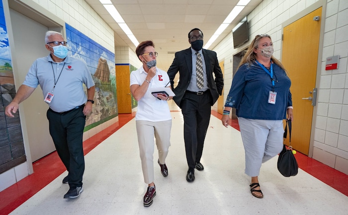 “We’re seeing how that goes,” Gadson said from behind his own face mask as he toured East High and welcomed students back.