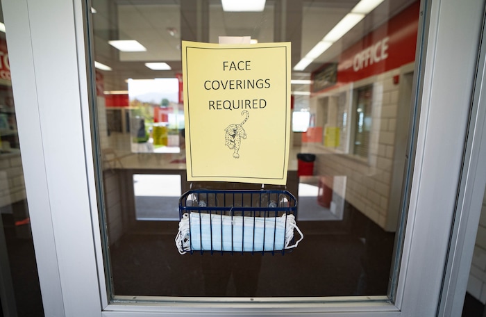 At East High, a flyer on the front door with the school’s leopard mascot notes, “Face coverings required.” Below it is a basket of extra medical masks for the taking.