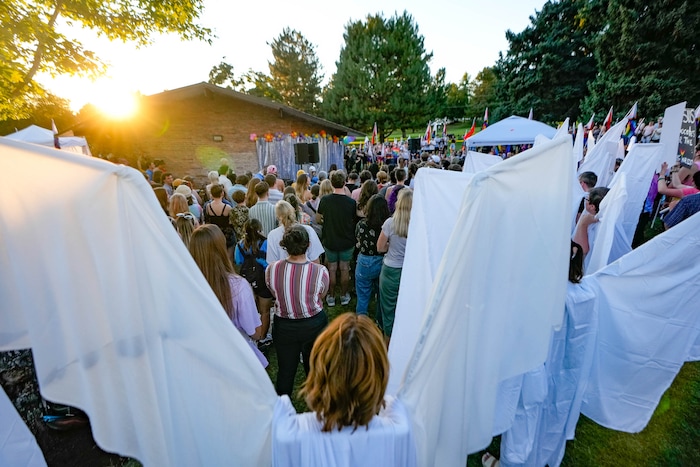 The angel’s wings, made of white sheets draped over PVC pipe that extended 3 feet above their shoulders, blocked most of the posters at the “Back to School Pride Night” at Kiwanis Park in Provo.