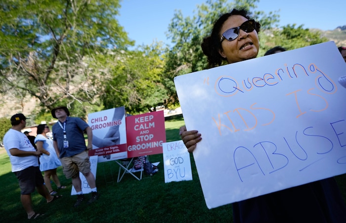 “This shouldn’t be at a public park,” said Thomas Stevenson, a BYU senior and the co-founder of the informal BYU Conservatives group, which has no restrictions for meeting on campus. He said there is “an element of social contagion with gender dysphoria” which is why they were protesting kids being at the show.