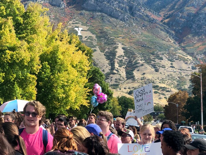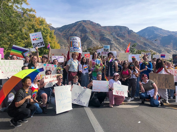 Around 100 students — clad in rainbow-colored clothes, holding signs and toting several types of pride flags — gathered along the south edge of the Provo campus, along 800 North between 400 and 500 East. Sebastian Stewart-Johnson, one of the organizers for the activist group The Black Menaces, has been planning the event since June, said group member Kylee Shepherd, and worked with the Provo Police Department to get a permit to march on the street.