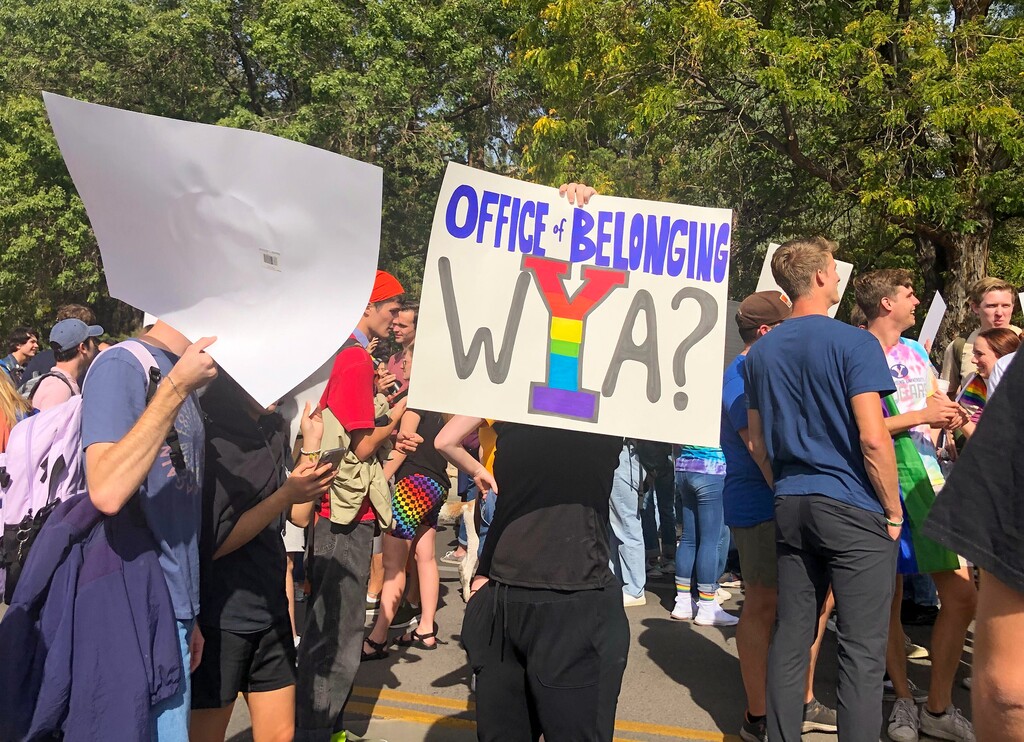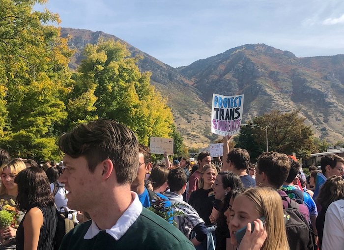 Dozens of students, and a smattering of allies, staged a walkout Tuesday at Brigham Young University, joining a national protest against restrictive LGBTQ policies at colleges with religious affiliations.