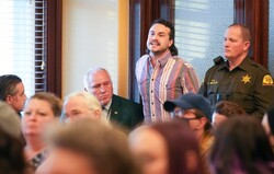 (Bethany Baker | The Salt Lake Tribune) Cheryl Saltzman, walks up to speak out in favor of HB269 as Marcie Robertson, a transgender resident assistant at USU, speaks in opposition of the bill during a Senate Education Committee meeting at the Utah Capitol in Salt Lake City Thursday, Jan. 30, 2025.