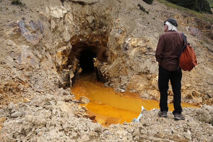 Pete McKay, San Juan County commissioner in Colorado, looks at the site, Monday, Aug. 10, 2015, where the Gold King Mine breach occurred, north of Silverton, Colo. Local officials in towns downstream from where millions of gallons of mine waste spilled into the San Juan River are demanding answers about possible long-term threats to the water supply. The 3 million gallons of mine waste included high concentrations of arsenic, lead and other heavy metals. Workers with the EPA accidentally unleashed the spill Wednesday as they inspected the abandoned mine site. (Jon Austria/The Daily Times via AP)
