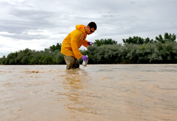 Hydrologic Technician Ryan Parker gathers water samples from the San Juan River, Tuesday, Aug. 11, 2015, in Montezuma Creek, Utah. A spill containing lead and arsenic from the abandoned Gold King Mine in Silverton, Colo., has been leaking into the Animas River, which flows into the San Juan River in Southern Utah, since last Wednesday. The spill was caused by a mining and safety team working for the EPA. (AP Photo/Matt York)