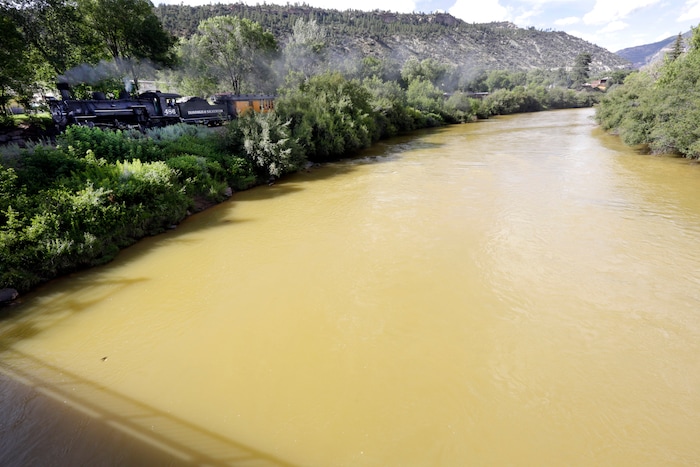 The Animas River is still flowing with toxic waste from the Gold King Mine on Saturday, Aug. 8, 2015, as seen from the 32nd Street Bridge in Durango, Colo., as the Durango & Silverton Narrow Gauge Railroad train goes by. (Jerry McBride/The Durango Herald via AP)