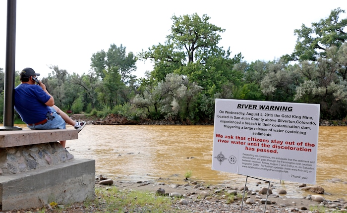 Travis Sells, of Farmington, N.M., looks at the orange sludge from a mine spill upstream flowing past Berg Park in Farmington Saturday, Aug. 8, 2015. About 1 million gallons of wastewater from Colorado's Gold King Mine began spilling into the Animas River on Wednesday when a cleanup crew supervised by the Environmental Protection Agency accidentally breached a debris dam that had formed inside the mine. The mine has been inactive since 1923. (Alexa Rogals/The Daily Times via AP)