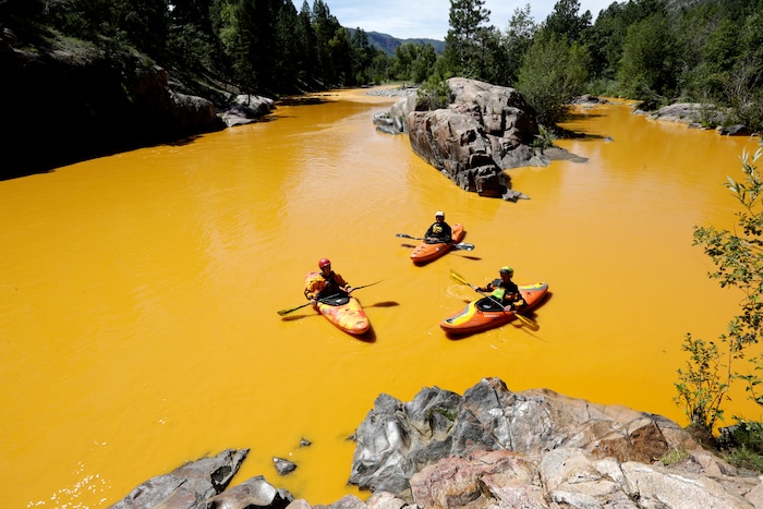 People kayak in the Animas River near Durango, Colo., Thursday, Aug. 6, 2015, in water colored from a mine waste spill. The U.S. Environmental Protection Agency said that a cleanup team was working with heavy equipment Wednesday to secure an entrance to the Gold King Mine. Workers instead released an estimated 1 million gallons of mine waste into Cement Creek, which flows into the Animas River. (Jerry McBride/The Durango Herald via AP) MANDATORY CREDIT