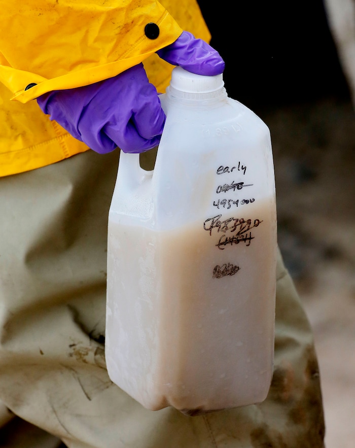 Hydrologic Technician Ryan Parker carries a water sample from the San Juan River, Tuesday, Aug. 11, 2015, in Montezuma Creek, Utah. A spill containing lead and arsenic from the abandoned Gold King Mine in Silverton, Colo., leaked into the Animas River, which flows into the San Juan River in Southern Utah, on Aug. 5. The spill was caused by a mining and safety team working for the EPA. (AP Photo/Matt York)
