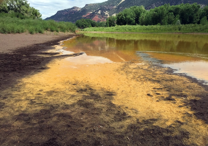 As the Animas River begins to recede it reveals a sludge left behind just north of Durango Colo., on Friday, Aug. 7, 2015, from the Gold King Mine spillage that happened on Wednesday north of Silverton Colo. Federal environmental officials say it's too early to know whether heavy metals that spilled into a river from a Colorado mine pose a health risk. (Jerry McBride(/The Durango Herald via AP)