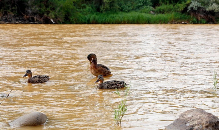 Ducks wade in the Animas River as orange sludge from a mine spill upstream flows past Berg Park in Farmington, N.M., Saturday, Aug. 8, 2015. About 1 million gallons of wastewater from Colorado's Gold King Mine began spilling into the Animas River on Wednesday when a cleanup crew supervised by the Environmental Protection Agency accidentally breached a debris dam that had formed inside the mine. The mine has been inactive since 1923( Alexa Rogals/The Daily Times via AP)