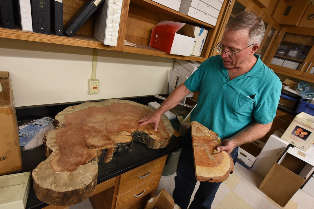 Scientists compare growth rings from standing trees with those seen in older wood on the ground to build a deeper record, according to Matt Bekker, a Brigham Young University geography professor whose lab is not far from Kitchen’s on the edge of the Provo campus.