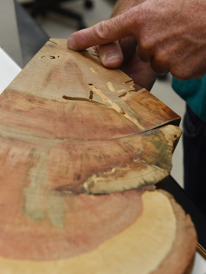 “By looking at where the injury occurs in that ring sequence, we can know the very year that fire occurred. Sometimes we can look at the seasonality of the fire,” Kitchen says, rubbing his finger across the wedge surface, finely sanded to accentuate its growth rings. “This here, an inch from the bark, is 1900. From 1900 to 2003, it grew an inch worth of wood, very slow growth; 1700 is about the same; 1600 is here, was a little better.”