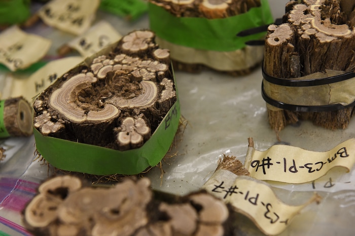 The counters in Kitchen’s lab are cluttered with cores and wedges from trees and discs of sagebrush, as well as pieces of sandpaper, microscopes and other tools of his craft. The samples are all marked with identification numbers and dots at regular intervals in their rings.