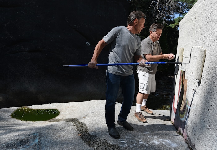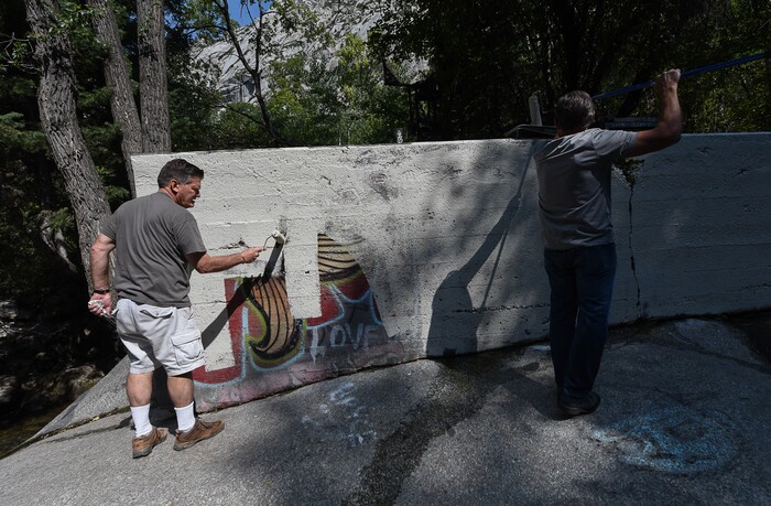 (Francisco Kjolseth | The Salt Lake Tribune) Michael Nebeker, left, and Scott Whipperman cover up graffiti that has proliferated in lower Little Cottonwood Canyon, where vandals, often wielding cans of fluorescent-colored spray paint, have covered granite faces, trees and structures. The vandalism is particularly apparent along the Temple Quarry Trail and the creek at the Moon Rock swimming hole and former pavilion site. Volunteers using donated equipment and solvents spend thousands of hours removing the paint from the rocks only to see graffiti return to the same faces or on rock nearby.