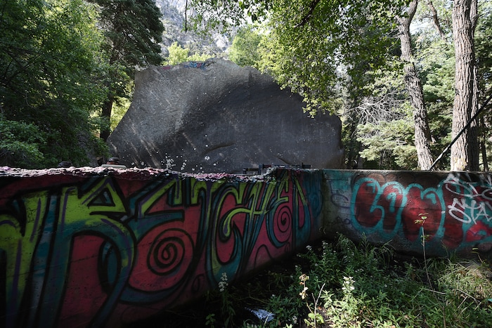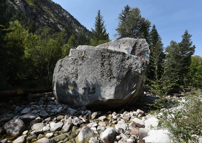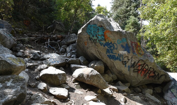 The old stone pavilion upstream from Moon Rock has been blanketed in graffiti, as have the rocks in a scree field above the now-reclaimed site. A party spot, the pavilion appears on websites where taggers post photos of their handiwork, according to Dave Fields, general manager at the up-canyon ski resort Snowbird.