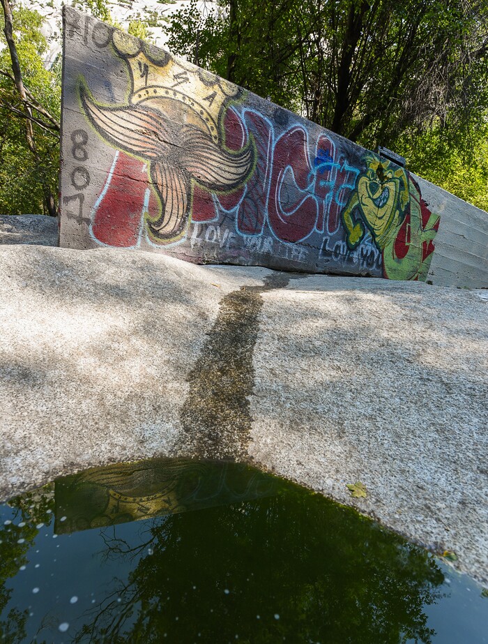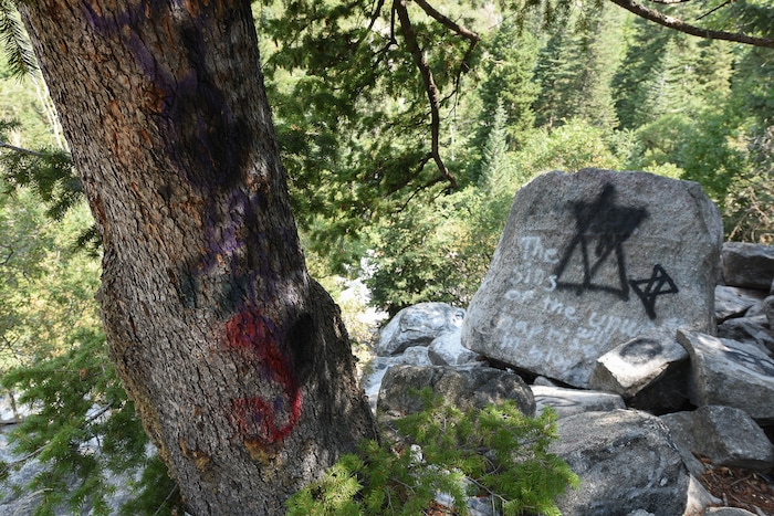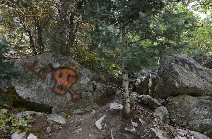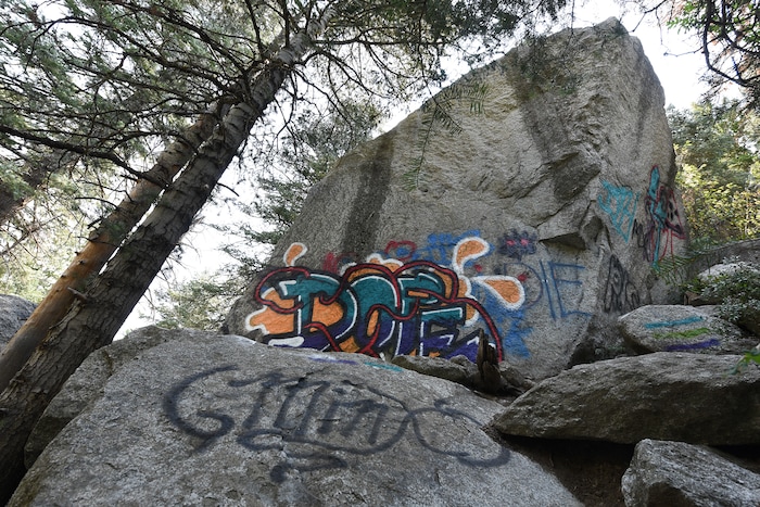 Graffiti is a crime against a community, but here, along a wooded stream below towering granite buttresses that frame the canyon’s mouth, the offense cuts deeper; it’s an outrage against the natural environment.