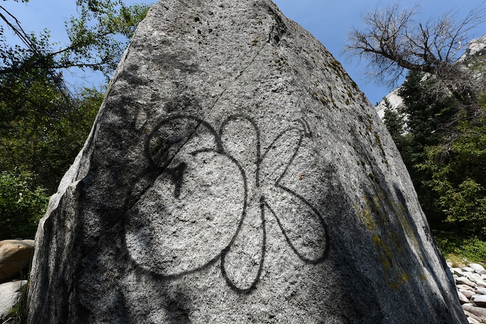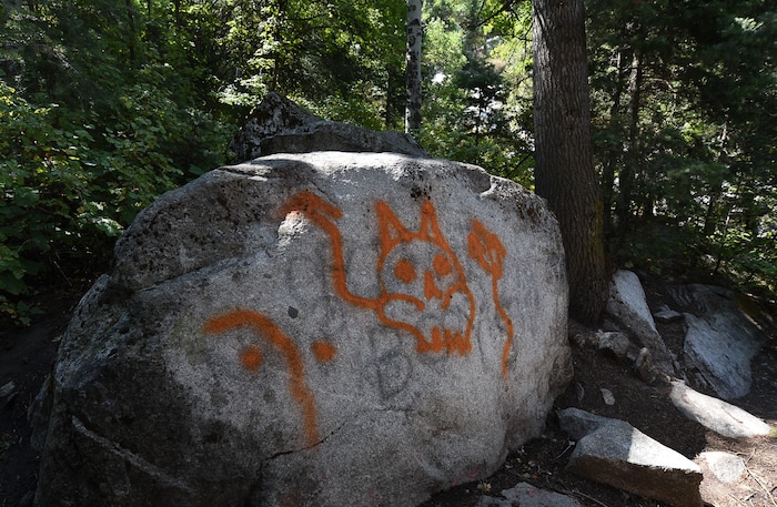 Snowbird paid for the pavilion’s removal last year, and volunteers have spent hundreds of hours cleaning up this site. The canyon’s defenders hoped it would remain unmolested, but vandals simply moved up the hill, where rocks now bear freshly painted arrows directing visitors to the latest gallery where lettering and pictures appear on dozens of boulders.