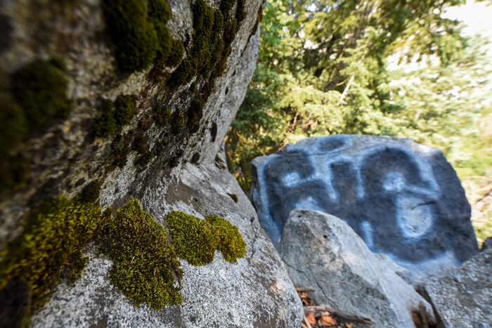 (Francisco Kjolseth | The Salt Lake Tribune) Graffiti has proliferated in lower Little Cottonwood Canyon, where vandals, often wielding cans of fluorescent-colored spray paint, have covered granite faces, trees and structures. The vandalism is particularly apparent along the Temple Quarry Trail and the creek at the Moon Rock swimming hole and former pavilion site. Volunteers using donated equipment and solvents spend thousands of hours removing the paint from the rocks only to see graffiti return to the same faces or on rock nearby.