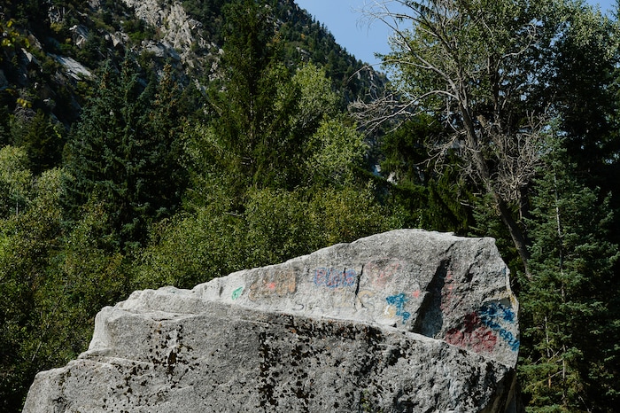 (Francisco Kjolseth | The Salt Lake Tribune) Graffiti has proliferated in lower Little Cottonwood Canyon, where vandals, often wielding cans of florescent-colored spray paint, have covered granite faces, trees and structures. The vandalism is particularly apparent along the Temple Quarry Trail and the creek at the Moon Rock swimming hole and former pavilion site. Volunteers using donated equipment and solvents spend thousands of hours removing the paint from the rocks only to see graffiti return to the same faces or on rock nearby.