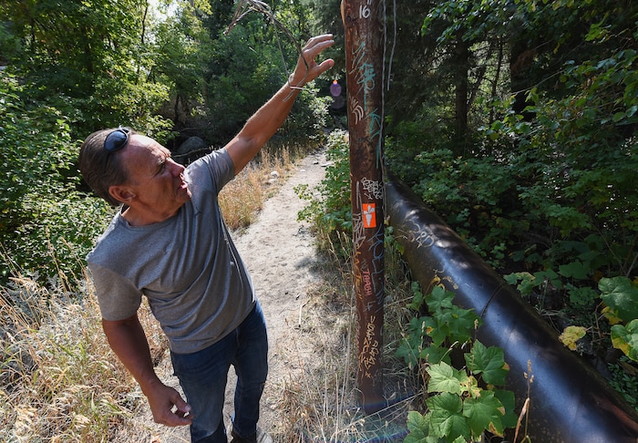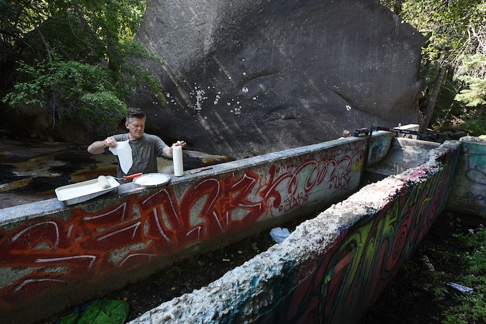 (Francisco Kjolseth | The Salt Lake Tribune) Scott Whipperman talks about the graffiti that has proliferated in lower Little Cottonwood Canyon, where vandals, often wielding cans of fluorescent-colored spray paint, have covered granite faces, trees and structures. The vandalism is particularly apparent along the Temple Quarry Trail and the creek at the Moon Rock swimming hole and former pavilion site. Volunteers using donated equipment and solvents spend thousands of hours removing the paint from the rocks only to see graffiti return to the same faces or on rock nearby.