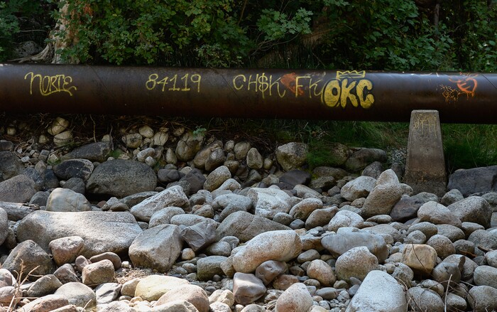 Volunteers wearing gloves and protective suits perform the hard work of applying Elephant Snot, the solvent deemed safe to use in watersheds tapped for drinking water. Designed for porous surfaces, it costs $86.99 a gallon on Amazon, where a can of Krylon “Glitter Blast” spray paint goes for $6.64.