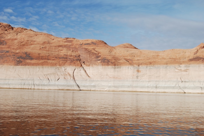 To get a feel for the 55-year-old reservoir’s plight, it helps to be in a boat sidled up against its vertical shoreline, oddly plastered with a white coating where normally the Entrada sandstone hums with pinks and reds streaked with dark varnishes.