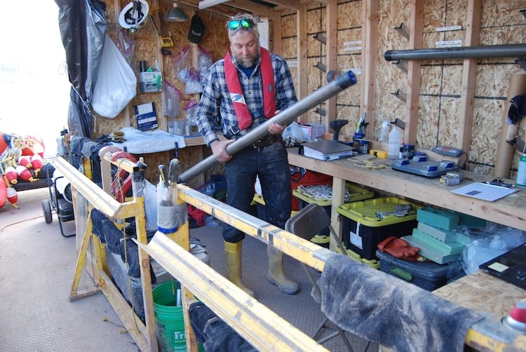 During the monthlong coring operation, the hydrologists spent much of their time in a makeshift structure dubbed the Core Shack that Hynek built on the barge with $400 worth of materials from Home Depot. Every 30 minutes, the drill crew brought up a 3-meter core and delivered it to the Core Shack, where it was cut in half, labeled, and its acrylic tube plugged with a blue cap on the upper end.