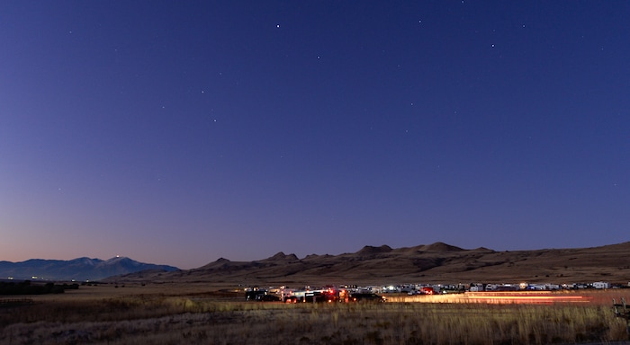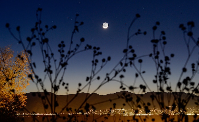 (Francisco Kjolseth | The Salt Lake Tribune) A crescent moon rises at first light as riders begin to ready their horses herd bison for the 33rd annual roundup, Saturday, Oct. 26, 2019, on Antelope Island, a state park located near Syracuse in Davis County. Every year Utah wildlife and parks officials move the animals from across the island so they can be weighed, tagged and given health screenings.