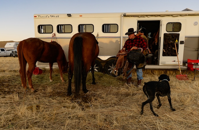 (Francisco Kjolseth | The Salt Lake Tribune) Nate Gallegos of Urda is joined by his dog Pearl as he saddles up Maggie and Ruby before the 33rd annual Bison Roundup, Saturday, Oct. 26, 2019, on Antelope Island, a state park located near Syracuse in Davis County. Every year Utah wildlife and parks officials move the animals from across the island so they can be weighed, tagged and given health screenings.