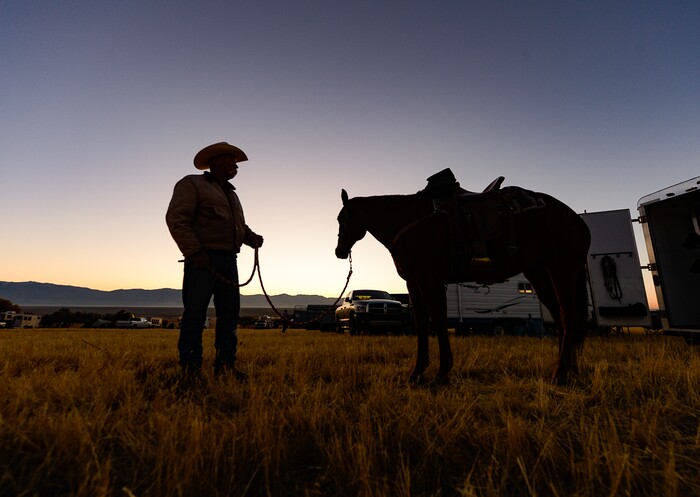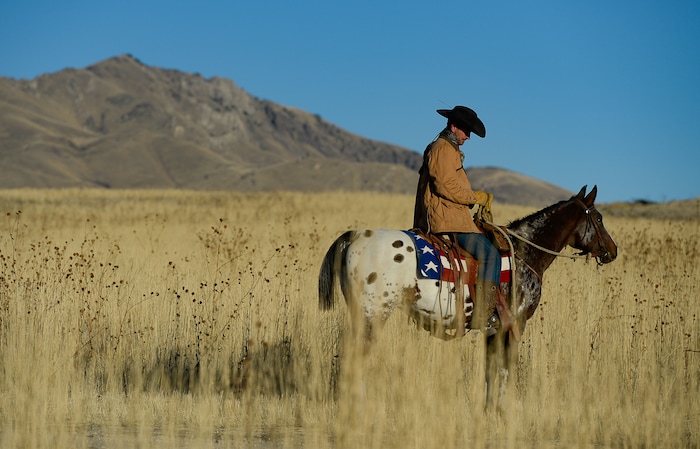(Francisco Kjolseth | The Salt Lake Tribune) A.J. Smith of Wallaby's Walla, Washington gets ready to ride his horse Doc in the 33rd annual roundup, Saturday, Oct. 26, 2019, on Antelope Island, a state park located near Syracuse in Davis County. Every year Utah wildlife and parks officials move the animals from across the island so they can be weighed, tagged and given health screenings.