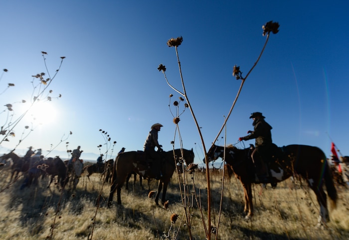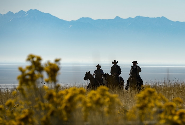 (Francisco Kjolseth | The Salt Lake Tribune) A dawn glow welcomes riders and their horses for the 33rd annual Bison Roundup, Saturday, Oct. 26, 2019, on Antelope Island, a state park located near Syracuse in Davis County. Every year Utah wildlife and parks officials move the animals from across the island so they can be weighed, tagged and given health screenings.