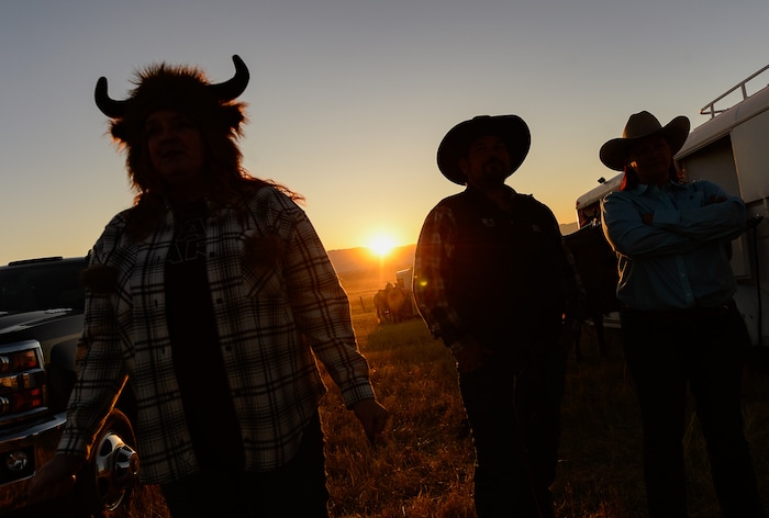 (Francisco Kjolseth | The Salt Lake Tribune) KyAnn Betz, left, wears her bison hat at first light as she joins John and Angie Peek for the 33rd annual roundup, Saturday, Oct. 26, 2019, on Antelope Island, a state park located near Syracuse in Davis County. Every year Utah wildlife and parks officials move the animals from across the island so they can be weighed, tagged and given health screenings.