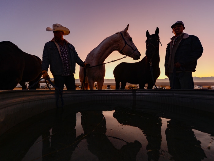 (Francisco Kjolseth | The Salt Lake Tribune) Horses feed at first light in preparation for the 33rd annual Bison Roundup, Saturday, Oct. 26, 2019, on Antelope Island, a state park located near Syracuse in Davis County. Every year Utah wildlife and parks officials move the animals from across the island so they can be weighed, tagged and given health screenings.