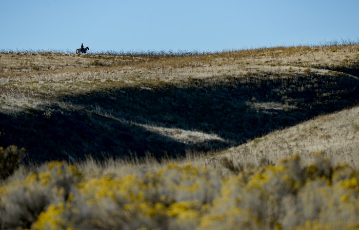 (Francisco Kjolseth | The Salt Lake Tribune) A lone cowboy crests a hill as during the 33rd annual Bison Roundup, Saturday, Oct. 26, 2019, on Antelope Island, a state park located near Syracuse in Davis County. Every year Utah wildlife and parks officials move the animals from across the island so they can be weighed, tagged and given health screenings.
