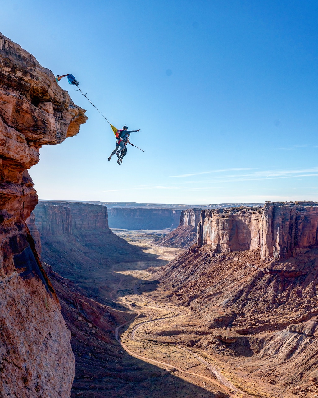 Since Olevsky's day in the spotlight, the canyons and sandstone formations around Moab have gained a reputation as a superb backdrop for high-angle sports, but now the focus has shifted to the "aerial" pursuits like rope swinging and walking on lines over chasms.