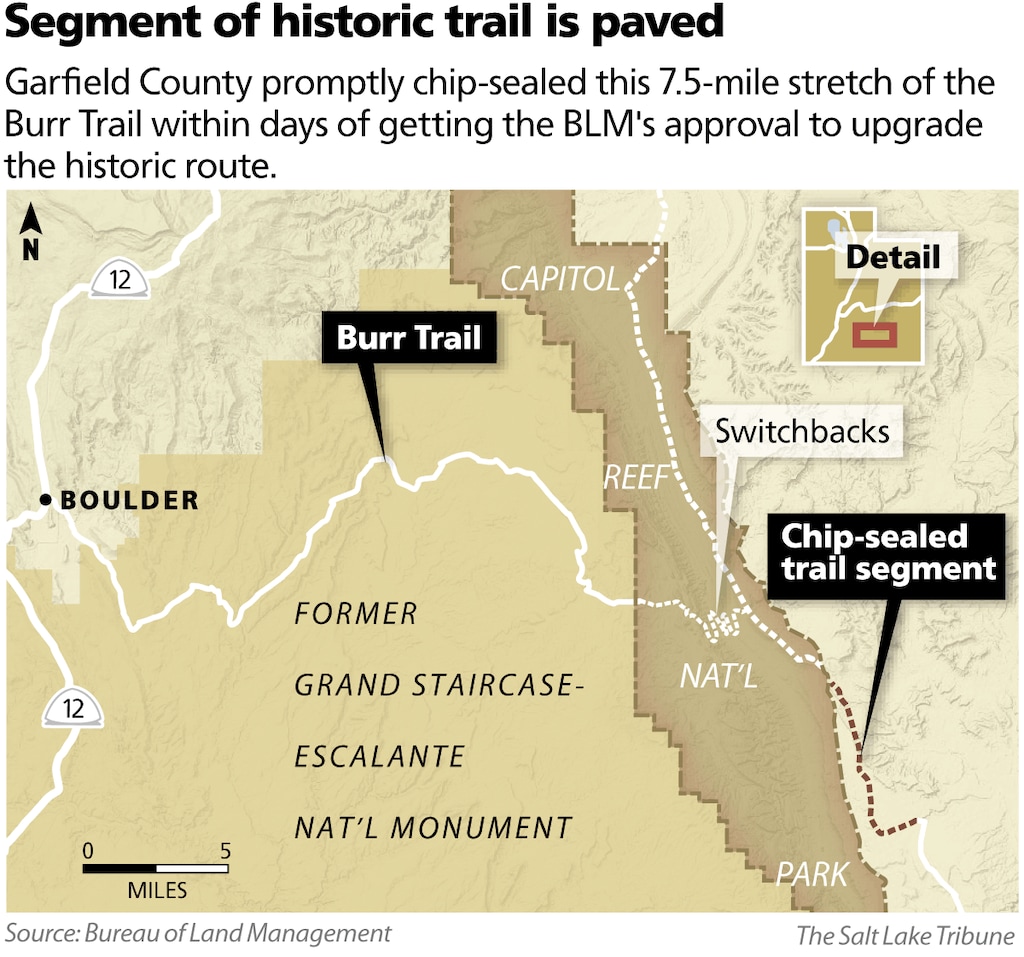 Upgrades to the formerly rugged Burr Trail have been a source of contention for decades, with the county pushing to put down gravel, then pave its entire 66 miles over the objections of environmentalists. The road winds along redrock desert from near Bullfrog Marina at Lake Powell, through Capitol Reef and lands stripped from Grand Staircase-Escalante National Monument, to Boulder.