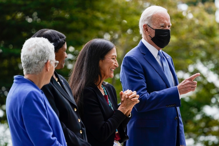 (Susan Walsh | The Associated Press) President Joe Biden is photographed on the North Lawn of the White House in Washington, Friday, Oct. 8, 2021, with White House national climate adviser Gina McCarthy, Brenda Mallory, chair of the council on environmental quality, and Interior Secretary Deb Haaland during an event announcing that his administration is restoring protections for two sprawling national monuments in Utah that have been at the center of a long-running public lands dispute.