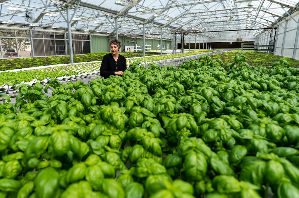 (Rick Egan | The Salt Lake Tribune) Page Westover checks the Basil in a hydroponic greenhouse at Snuck farm in Pleasant Grove, on Wednesday, May 11, 2022.