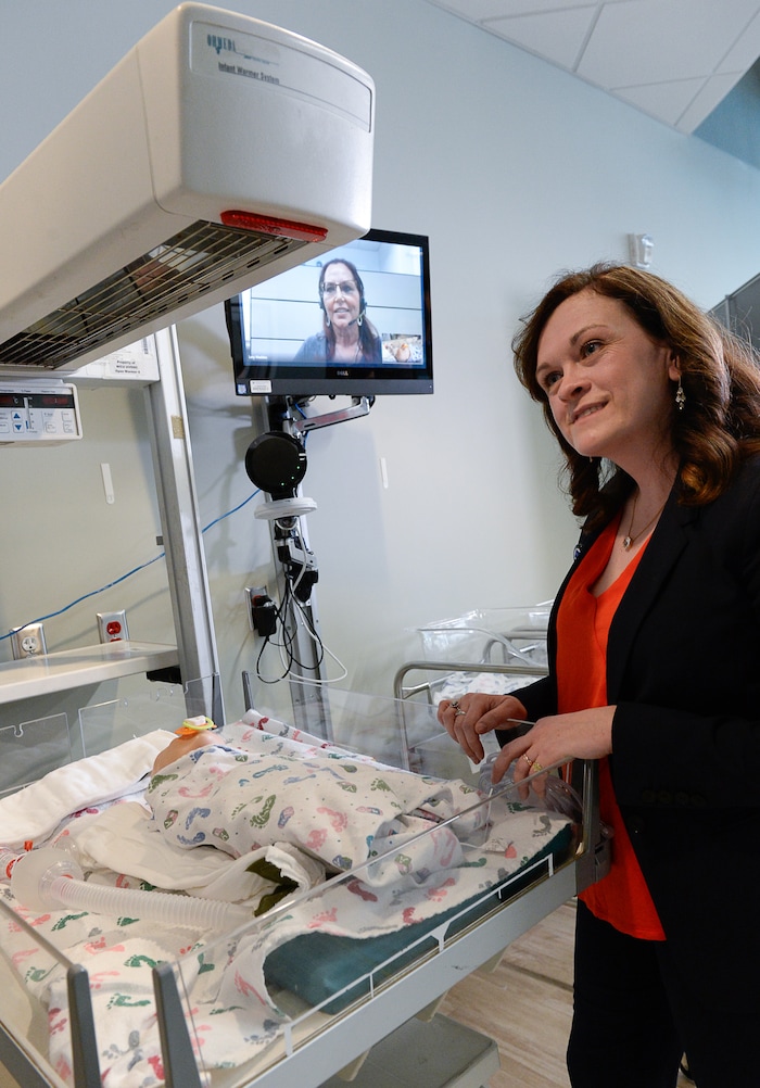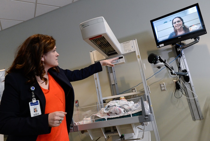 (Francisco Kjolseth | The Salt Lake Tribune) Heidi Nedreberg, Marketing Manager for Connect Care Pro describes scenarios of newborn care with the help of nurse Lory Maddox, projected remotely on screen. Intermountain Healthcare announced the launch of "one of the nation's largest virtual hospital services." It will involve 500 caregivers, offering telehealth services on everything from basic care to stroke evaluation and newborn critical care. The Virtual Hospital Services Testing Laboratory showcased several medical services on Wednesday, Feb. 28, 2018, in Midvale.
