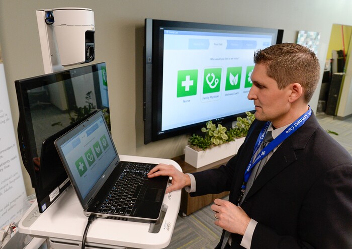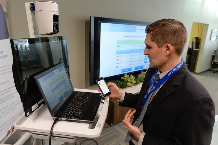 (Francisco Kjolseth | The Salt Lake Tribune) Tim Lovell, Business Manager for Connect Care Direct to Consumer Telemedicine for Intermountain Healthcare demonstrates the way various ways patients and doctors can connect to address medical needs. Intermountain Healthcare opened a new hospital without buildings or walls with "one of the nation's largest virtual hospital services." It will involve 500 caregivers, offering telehealth services on everything from basic care to stroke evaluation and newborn critical care. The Virtual Hospital Services Testing Laboratory showcased several medical services on Wednesday, Feb. 28, 2018, in Midvale.