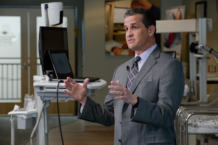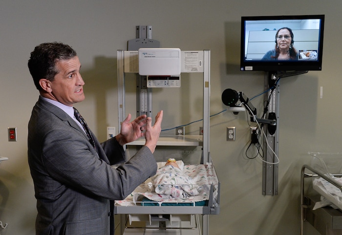 (Francisco Kjolseth | The Salt Lake Tribune) Jim Sheets, Vice President for Outreach Services at Intermountain Healthcare announces the launch of "one of the nation's largest virtual hospital services," as he describes newborn care with the help of nurse Lory Maddox, projected remotely on screen. It will involve 500 caregivers, offering telehealth services on everything from basic care to stroke evaluation and newborn critical care as bedside doctors can receive medical expertise from other professionals remotely. The Virtual Hospital Services Testing Laboratory showcased several medical services on Wednesday, Feb. 28, 2018, in Midvale.