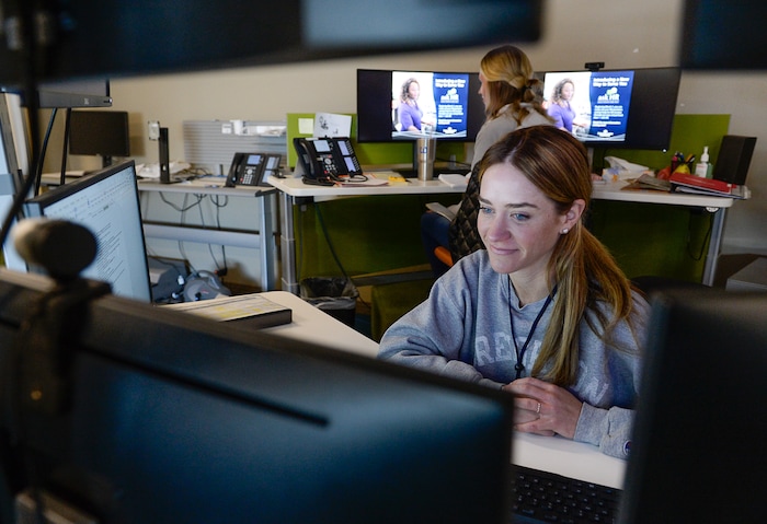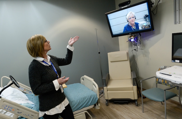 (Francisco Kjolseth | The Salt Lake Tribune) Tara Larkin, Operations Director for TeleHealth Services at Intermountain Healthcare is joined by critical care nurse Vanessa Washington, on screen, as they demonstrate the mechanics of proving virtual care in a hospital room. Intermountain Healthcare launched a new hospital without building or walls with "one of the nation's largest virtual hospital services." It will involve 500 caregivers, offering telehealth services on everything from basic care to stroke evaluation and newborn critical care. The Virtual Hospital Services Testing Laboratory showcased several medical services on Wednesday, Feb. 28, 2018, in Midvale.
