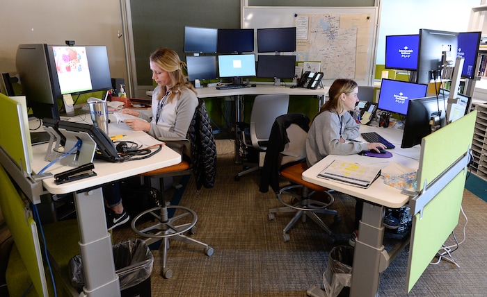 (Francisco Kjolseth | The Salt Lake Tribune) Nurse Jenny Williams, left, and Doctor Rachel Parbhu, connect doctors and patients remotely from the Telecritical Care Center in Midvale. Intermountain Healthcare announced the launch of "one of the nation's largest virtual hospital services." It will involve 500 caregivers, offering telehealth services on everything from basic care to stroke evaluation and newborn critical care. The Virtual Hospital Services Testing Laboratory showcased several medical services on Wednesday, Feb. 28, 2018,.