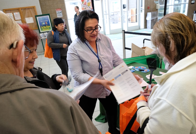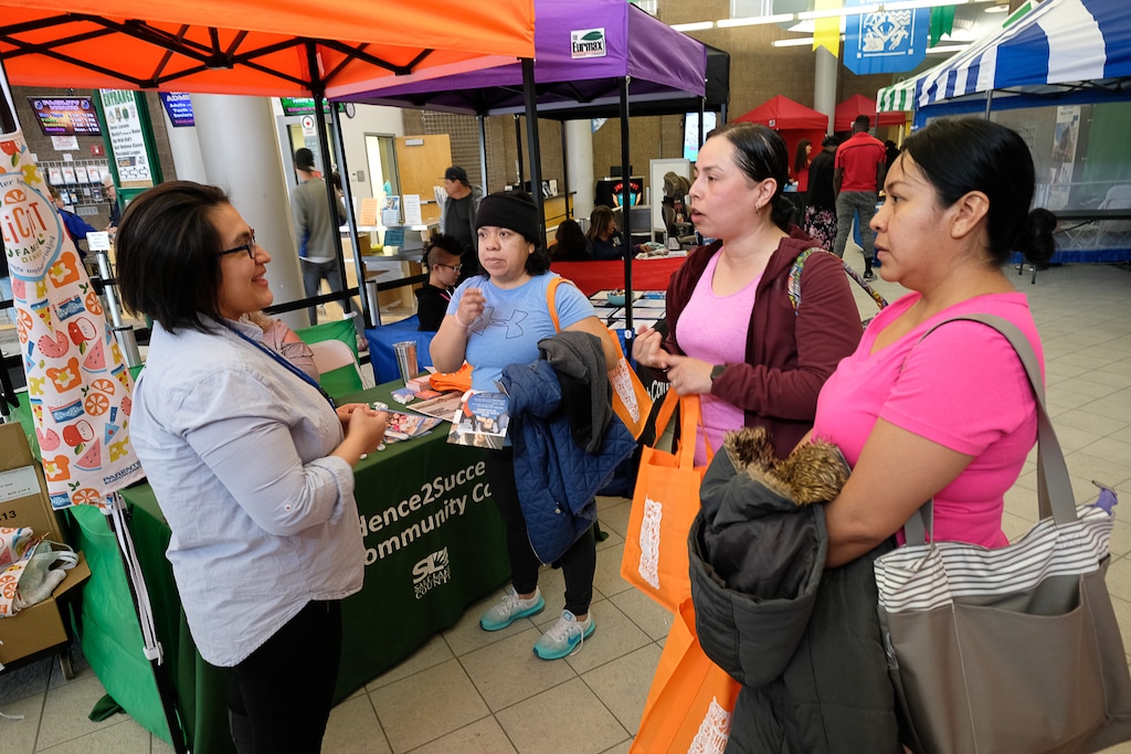 (Francisco Kjolseth | The Salt Lake Tribune) Mercedes Rodriguez, center, health education coordinator with the Kearns Community Coalition in Kearns, speaks with local residents about programs to help reduce vaping and alcohol use among youth during a health fair at the Kearns Oquirrh Park Fitness Center on Tuesday, March 3, 2020.