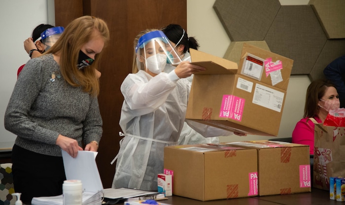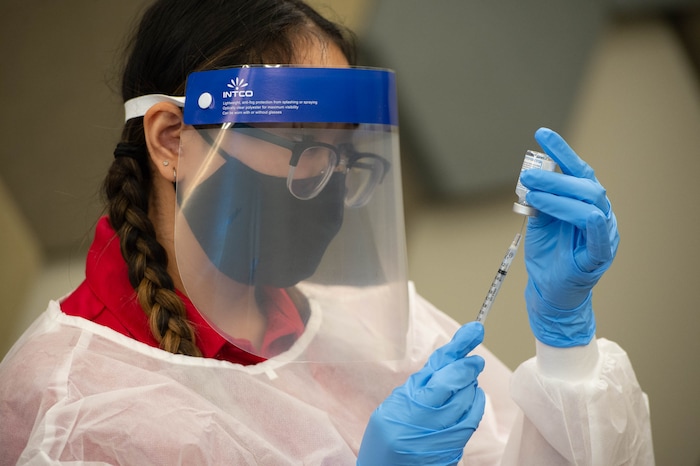 At The Ridge Foothill on Tuesday, Moench and fellow resident Joan Poston were the first to sit by the table where nurses in the now-familiar wrappings of personal protective equipment — masks, face shields, rubber gloves and hazmat overalls — formed an assembly line to prepare the syringes. Other staff worked the line of patients, taking temperatures and making sure their paperwork was in order.