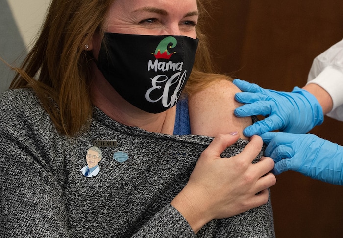 Poston got her shot first, accompanied by applause and a few noisemakers, making the room sound like New Year’s Eve had arrived a couple of days early. Then it was Moench’s turn, eliciting more applause.