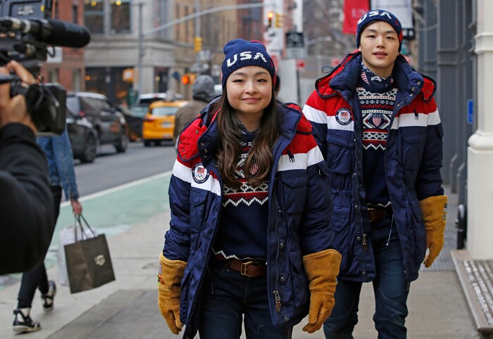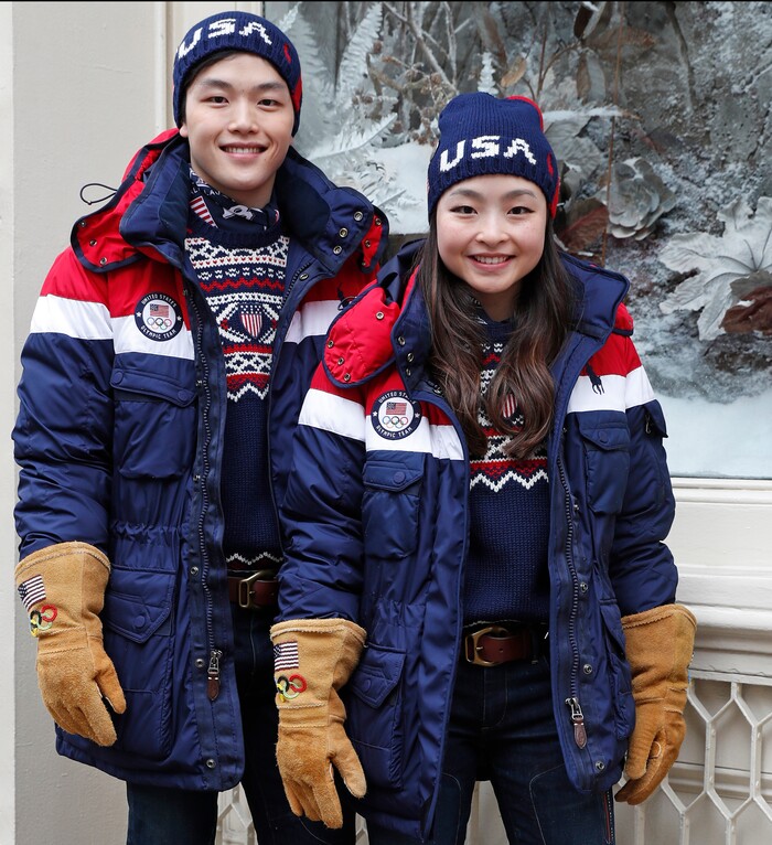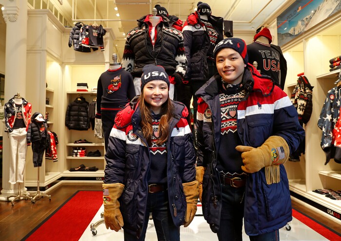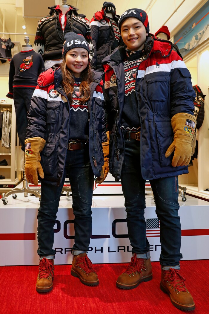 The uniforms were modeled in a Polo Ralph Lauren store in downtown Manhattan by sister-brother, Lauren-sponsored ice dancing team Maia and Alex Shibutani.