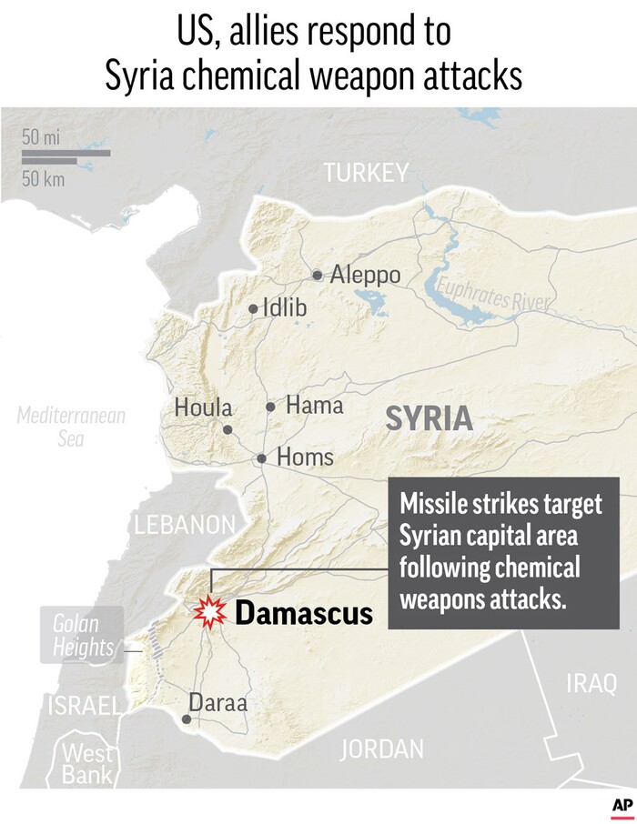 Map locates the capital of Syria, where U.S. and ally strikes were reported in retaliation of Syria’s use of chemical weapons.